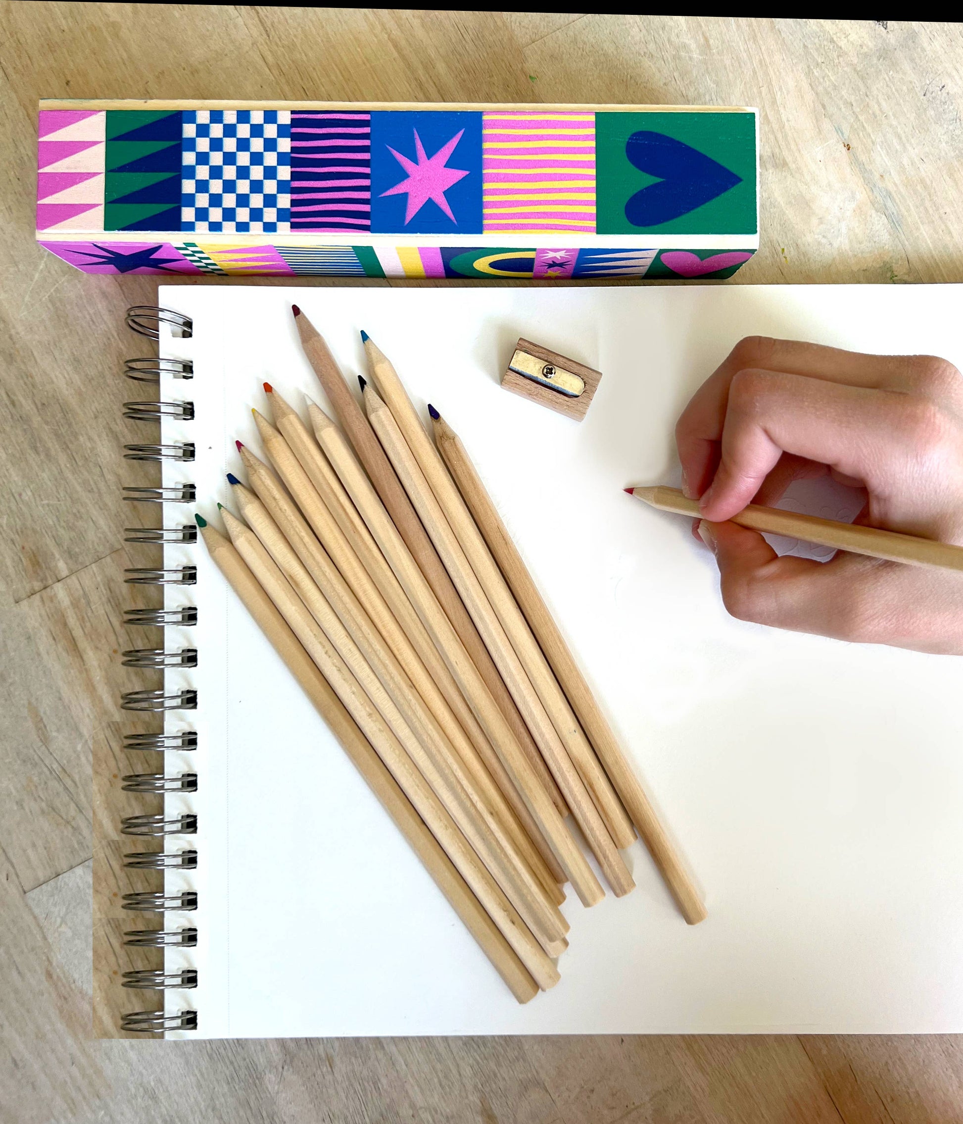 Beautiful graphic wooden pencil box with slide top that doubles as a ruler! Filled with brightly colored pencils + a wooden sharpener.